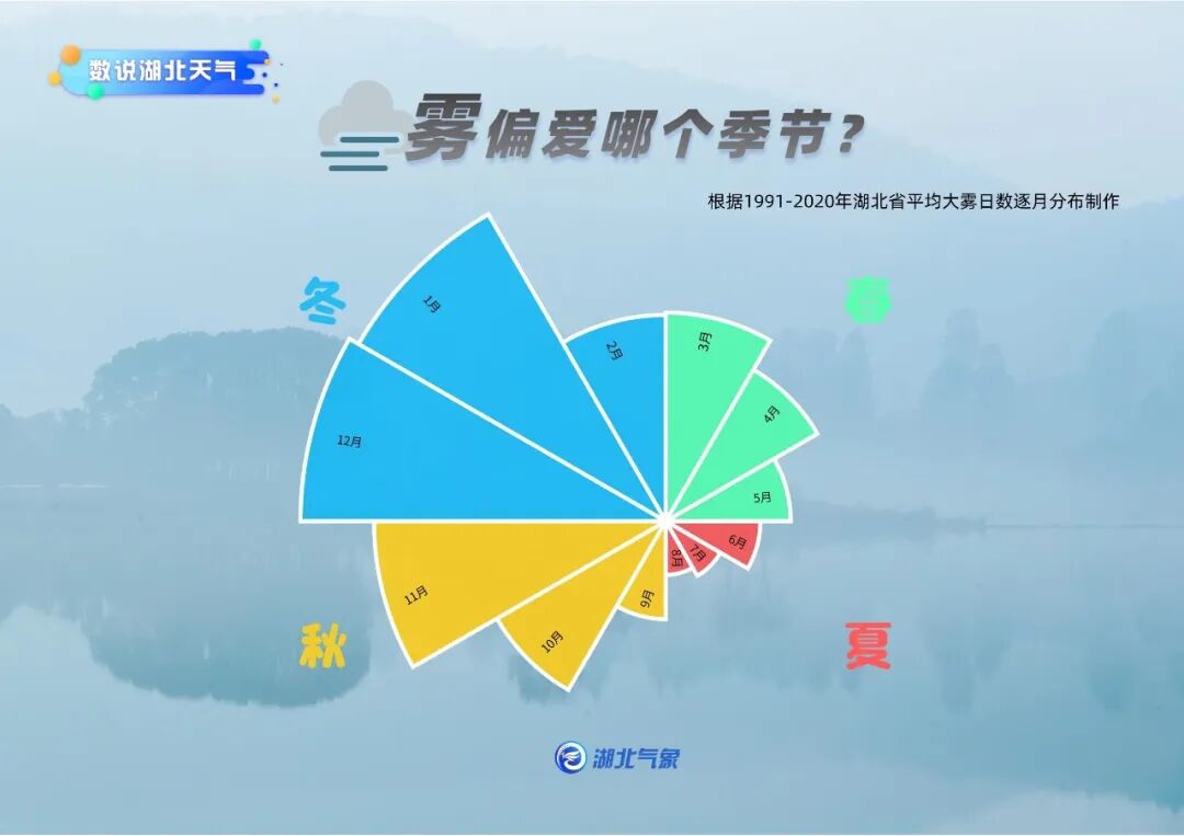 湖北的雾日与季节变化,成一定相关性,每年12月-1月是全年雾日最多的月份,其次是秋季的10-11月。