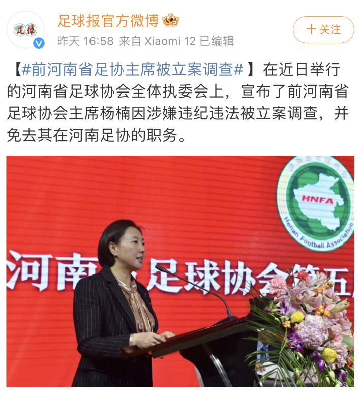 据正观新闻2021年报道,当年的3月20日,河南省足球协会第五届会员代表大会召开,当时46岁的杨楠当选河南省足协主席。