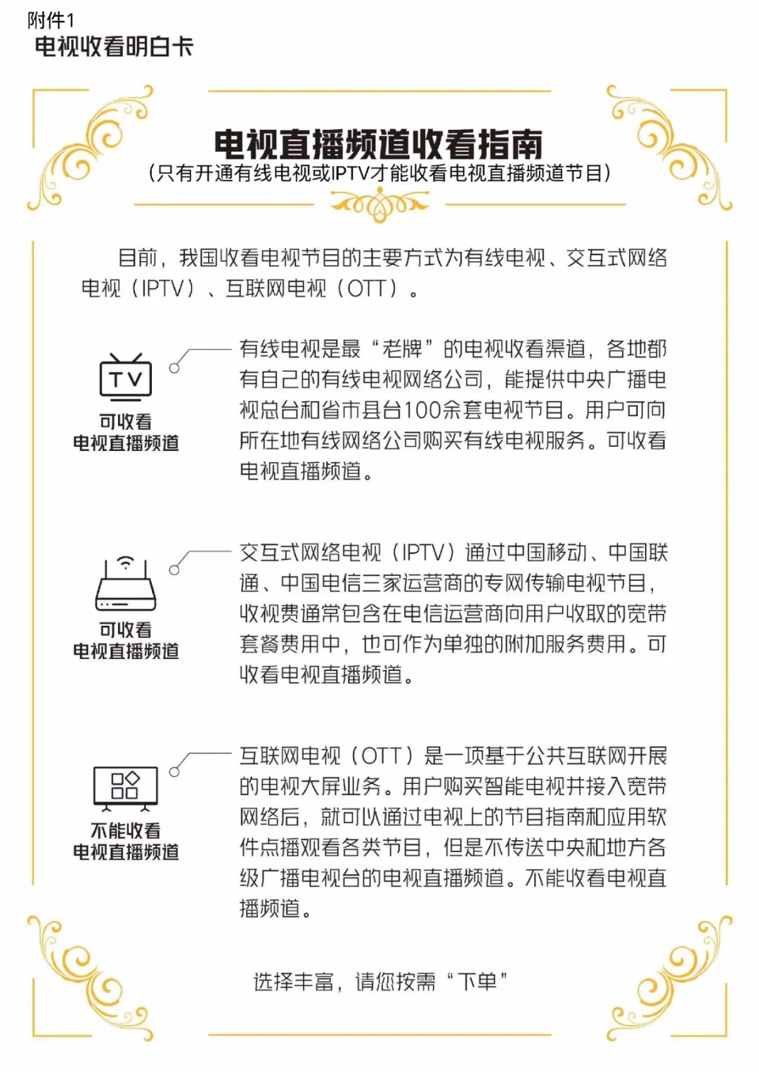 关于开展电视收看“明白卡”提示工作的通知 根据治理电视“套娃”收费和操作复杂工作部署要求,国家广播电视总局、工业和信息化部、国家市场监督管理总局、中国消费者协会决定开展电视收看“明白卡”提示工作。自2023年11月起,各电视机生产厂商要将制作完成的《电视收看“明白卡”》装入电视机包装箱内的说明材料中,同时在电商销售页面、线下实体销售和厂商入户安装电视机过程中,将“明白卡”内容向用户明确展示,并告知用户只有开通有线电视或IPTV方可收看电视直播频道节目。