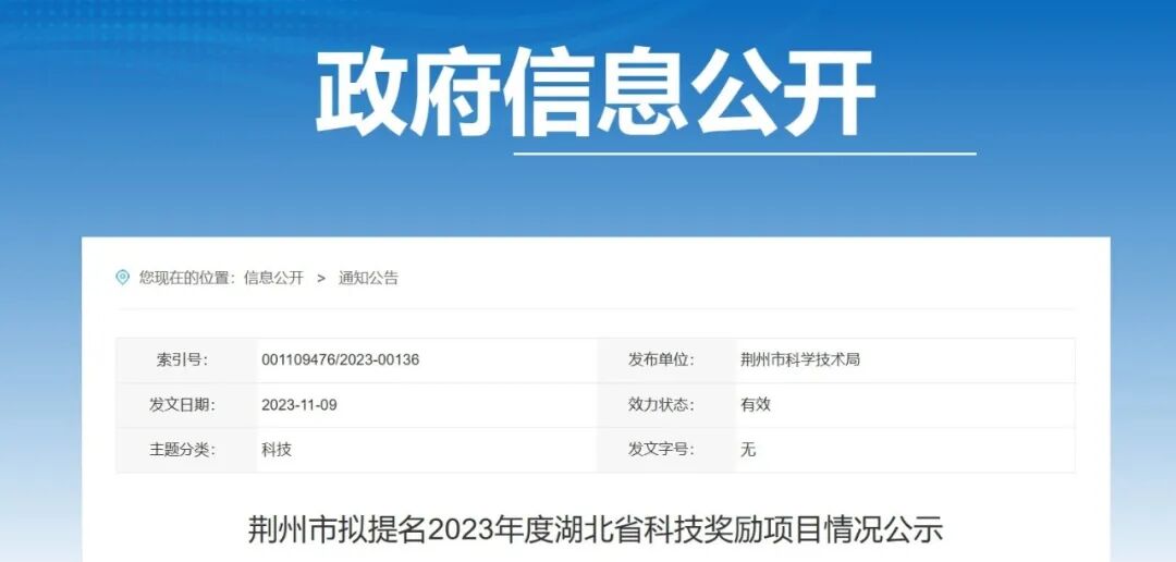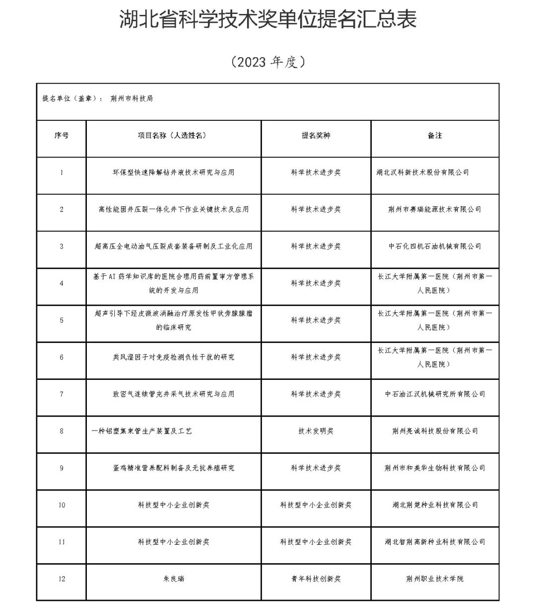 按照省科技厅要求,现将荆州市拟提名的2023年度湖北省科技奖励项目公示如下,如有任何异议,请及时与荆州市科技局成果科联系。公示期为2023年11月10日至2023年11月16日。联系人:黄芹 杜宇恒 电话:8810029
