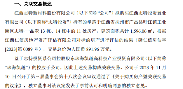 志特新材(300986,股价14.49元,市值35.7亿元)11月10日晚间披露,公司拟购买江西志特投资置业有限公司(以下简称“江西志特”)持有的坐落于江西省抚州市广昌县旴江镇工业园区志特·一品墅13栋、14栋中的11处房产。按照规划,上述房产拟作为员工宿舍使用。