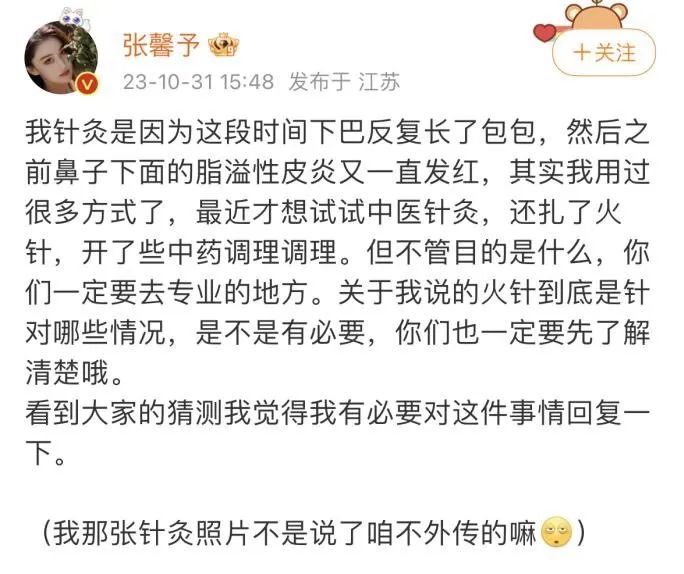 对此,张馨予回应,是因为这段时间下巴反复长了包包(痘痘),鼻子下面的脂溢性皮炎也一直发红,尝试过多种方式治疗后效果不佳,便想尝试一下中医针灸。她强调,自己并不是因为跟风或轻信针灸而选择这种治疗方法,而是出于对自身健康的关心和探索。