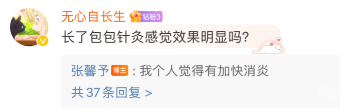 评论区有网友询问“长了包包针灸效果明显吗?”张馨予还热心回复:个人觉得有加快消炎。