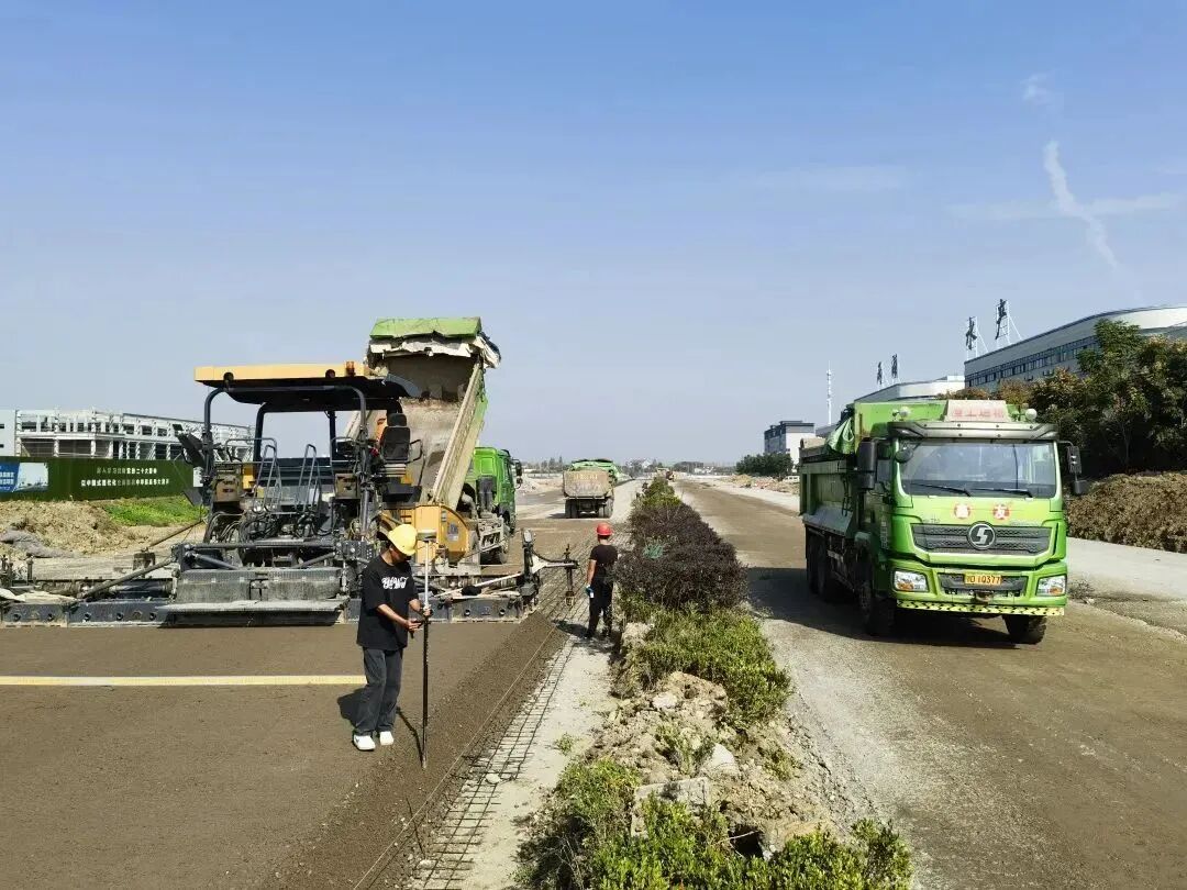 近日,太湖大道改扩建项目现场,渣土车来回穿梭,挖掘机挥舞着巨臂,摊铺机和轧路机正协同进行水泥稳定碎石摊铺作业,施工人员抢抓晴好天气,全力推进项目建设。