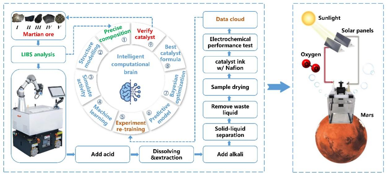 中国科学技术大学与深空探测实验室研究团队合作,采用前期研制的机器化学家“小来”平台,高效融合人工智能和自动化机器实验,进行产氧电催化剂的创造和制备。机器化学家“小来”系统包括移动机器人、计算大脑、云服务器和多个不同功能的化学工作站,能够执行高通量实验任务;理论模拟与精准实验双循环的机器自动化过程集成了从原料准备、样品合成、性能测试和配方优化步骤,这种智能研究范式极大地加速了新材料发现过程,最终,机器人在两个月内就完成了普通人类化学家需要做2000年的复杂优化工作,利用火星陨石制备出了实用的产氧电催化剂。