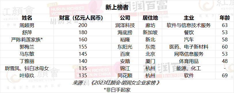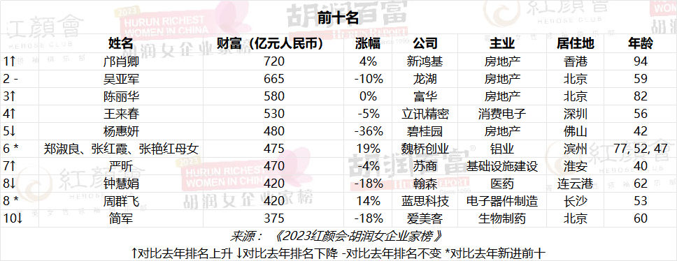 排名上升的还有富华82岁的陈丽华,以580亿元财富排名第三;立讯精密56岁的王来春,以530亿元排名第四;苏商集团40岁的严昕,以470亿元位列第七。排名下降的有翰森62岁的钟慧娟,以420亿元排名第八;爱美客60岁简军,以375亿元排名第十。魏桥创业的郑淑良、张红霞、张艳红母女和蓝思科技53岁的周群飞,是前十名中2位新人。
