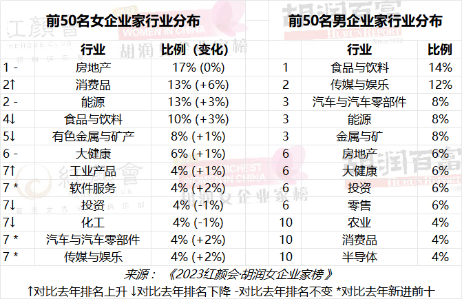 从行业分布看,前50名女企业家中,房地产行业占比最高,以17%排名第一,消费品和能源以13%并列第二。胡润百富榜前50名男企业家中,食品饮料和传媒娱乐行业占比最高,分别有14%和12%,房地产以6%排名第六。