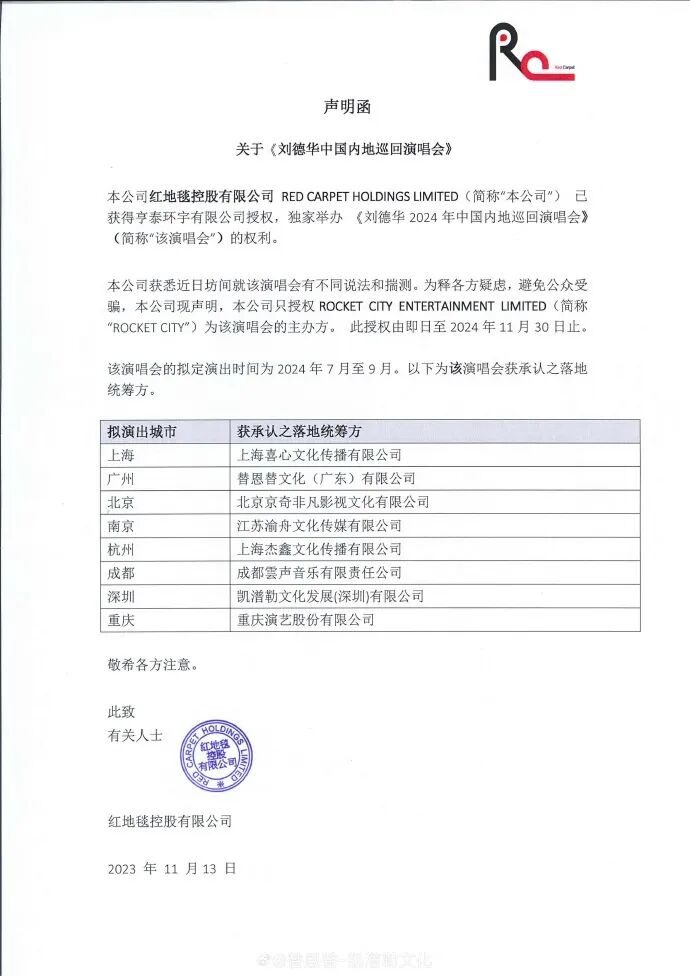 就在刚刚,获得《刘德华2024年中国内地巡回演唱会》独家举办权的红地毯控股有限公司通过声明函,官宣了刘德华巡演将于明年7月至9月途经上海、广州、北京、南京、杭州、成都、深圳和重庆。具体演出时间及举办场馆,将由落地统筹方确认。