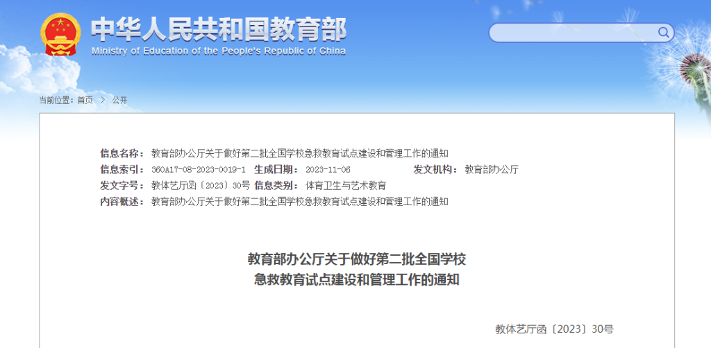 通知一并发布《第二批全国学校急救教育试点工作指南》,从总体要求、重点任务两个方面部署推进试点工作。