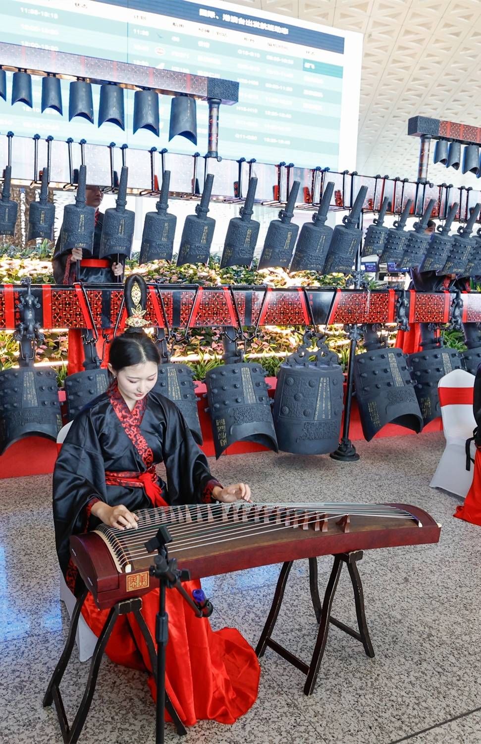 武汉天河机场举办主题为“展示荆楚文化 共绘人文空港”的编钟乐舞音乐会。(湖北日报全媒记者 倪娜 通讯员 杨钻 张蒙 摄)