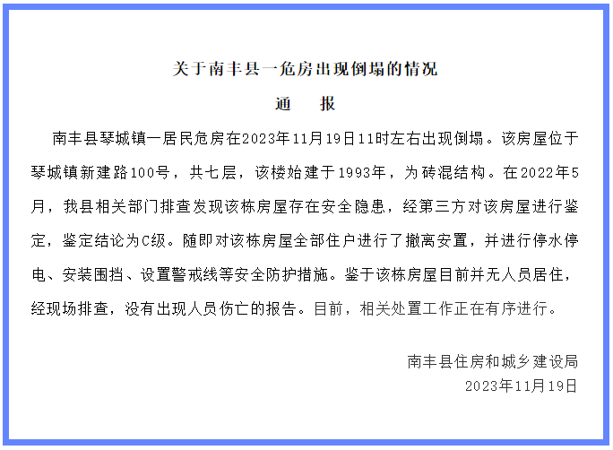 11月19日,江西省南丰县住房和城乡建设局发布“关于南丰县一危房出现倒塌的情况”的通报: