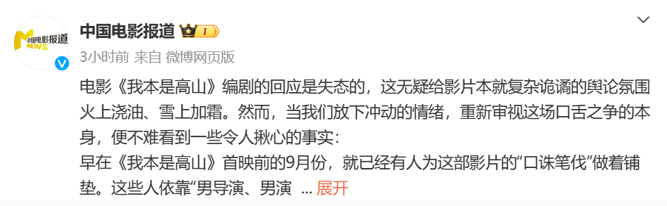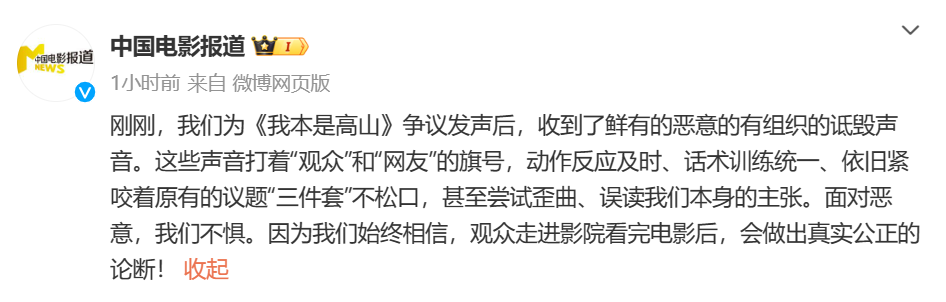 刚刚,我们为《我本是高山》争议发声后,收到了鲜有的恶意的有组织的诋毁声音。这些声音打着“观众”和“网友”的旗号,动作反应及时、话术训练统一、依旧紧咬着原有的议题“三件套”不松口,甚至尝试歪曲、误读我们本身的主张。面对恶意,我们不惧。因为我们始终相信,观众走进影院看完电影后,会做出真实公正的论断!