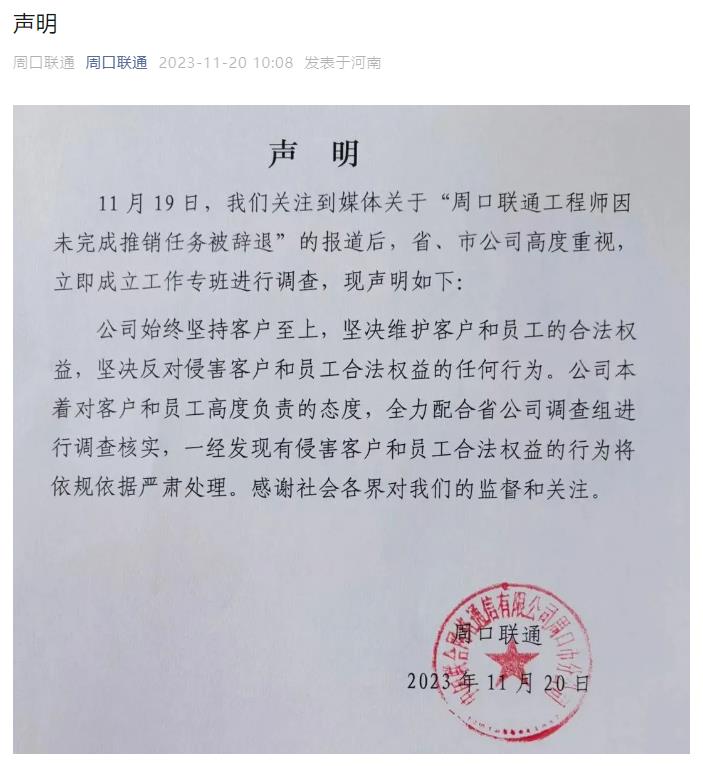 11月20日,“周口联通”公众号发布声明称,针对“周口联通工程师因未完成推销任务被辞退”的报道,省、市公司立即成立工作专班进行调查。公司始终坚持客户至上,坚决维护客户和员工的合法权益,坚决反对侵害客户和员工合法权益的任何行为。公司本着对客户和员工高度负责的态度,全力配合省公司调查组进行调查核实,一经发现有侵害客户和员工合法权益的行为将依规依据严肃处理。