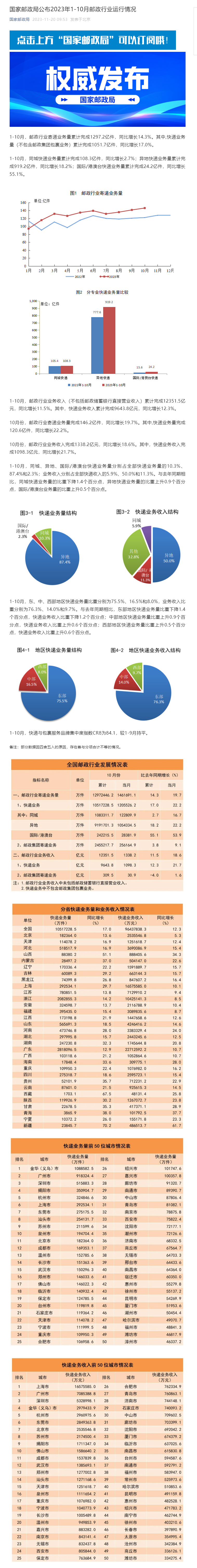 1-10月,同城快递业务量累计完成108.3亿件,同比增长2.7%;异地快递业务量累计完成919.2亿件,同比增长18.2%;国际/港澳台快递业务量累计完成24.2亿件,同比增长55.1%。