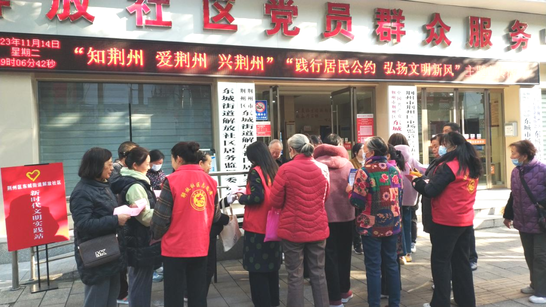 江汉风报道:11月14日,解放社区新时代文明实践站举行“知荆州 爱荆州 兴荆州”“践行居民公约 弘扬文明新风”主题宣传活动。