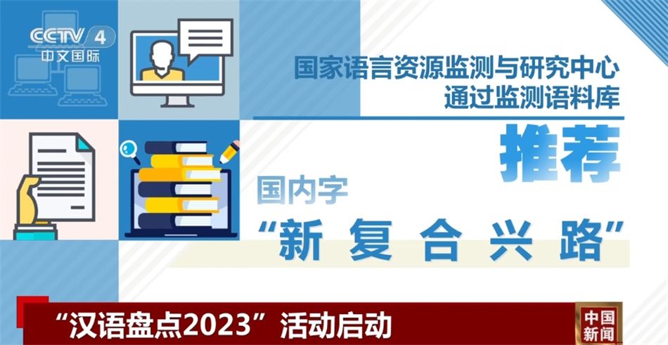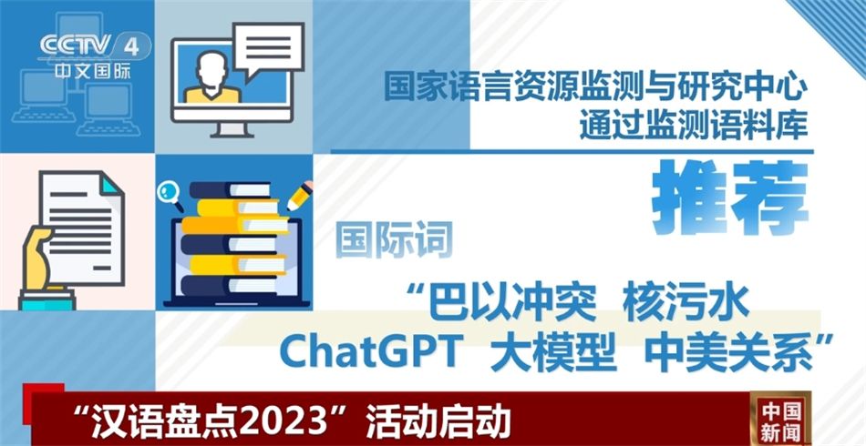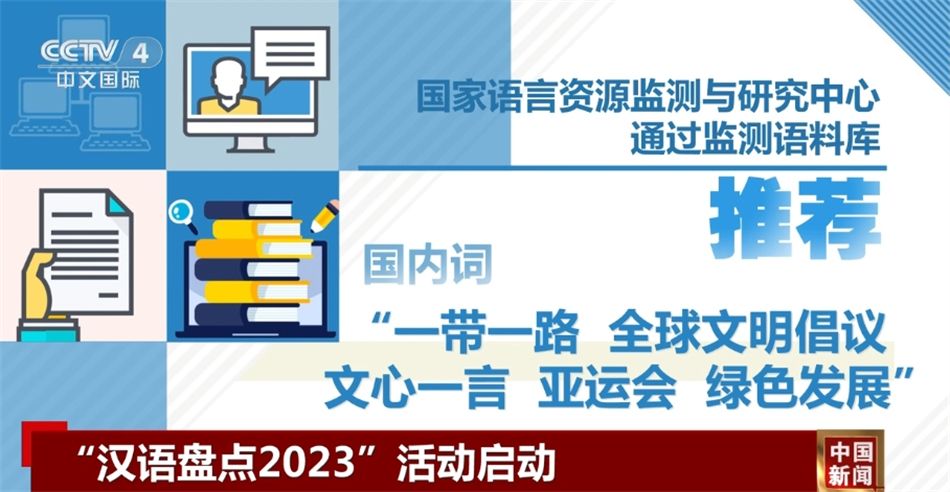 在启动仪式上,主办方推出“专家版本”和“大数据版本”的年度推荐字词,为活动预热。国家语言资源监测与研究中心通过监测语料库,推荐国内字“新、复、合、兴、路”和国际字“战、乱、变、债、危”,国内词“一带一路、全球文明倡议、文心一言、亚运会、绿色发展”和国际词“巴以冲突、核污水、ChatGPT、大模型、中美关系”。