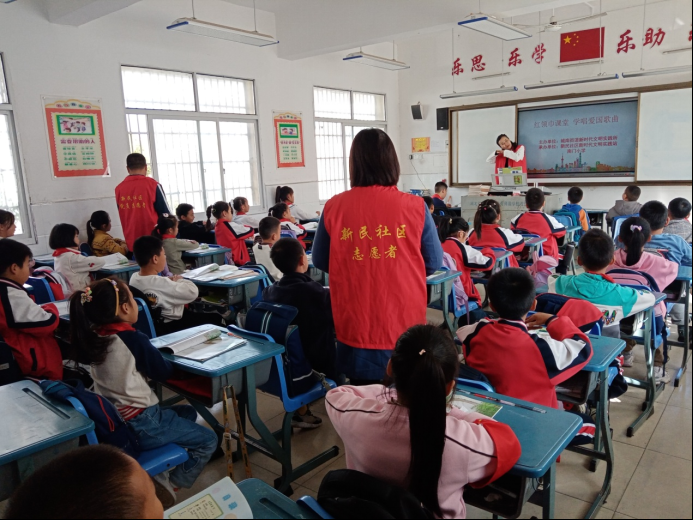 新民社区新时代文明实践站精心挑选了《没有共产党就没有新中国》《歌唱祖国》《我和我的祖国》等耳熟能详、脍炙人口的红色爱国主义歌曲,从11月起,在课间、午休时间循环播放。