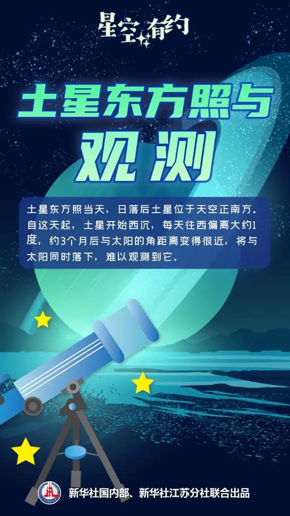 “土星东方照当天,日落后土星位于天空正南方。自这天起,土星开始西沉,每天往西偏离大约1度,约3个月后与太阳的角距离变得很近,将与太阳同时落下,难以观测到它。”王科超说。