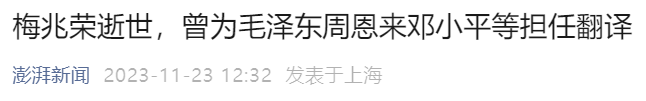 澎湃新闻从梅兆荣大使亲友处获悉,中国前驻德国大使、前中国人民外交学会会长梅兆荣于11月22日上午10时许在北京逝世,享年89岁。