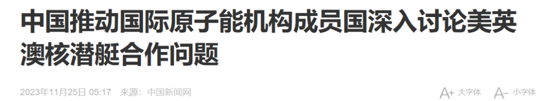 维也纳消息:国际原子能机构11月理事会正在维也纳召开。根据中国主张,美英澳核潜艇合作问题第11次正式列入机构会议议程。24日,中国常驻国际原子能机构代表李松大使在理事会专题讨论中作主旨发言,全面阐述中方立场主张。