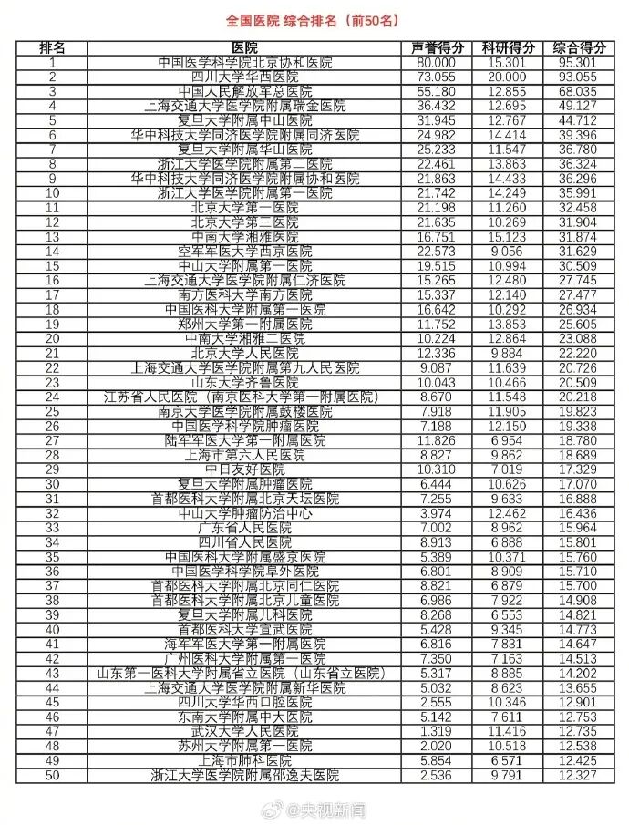 全国共有100家医院进入“复旦版中国医院综合排行榜”,45个专科(前10名)榜上有名。