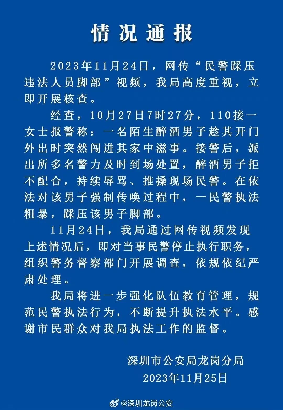 2023年11月24日,网传“民警踩压违法人员脚部”视频,我局高度重视,立即开展核查。