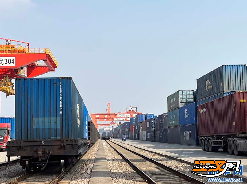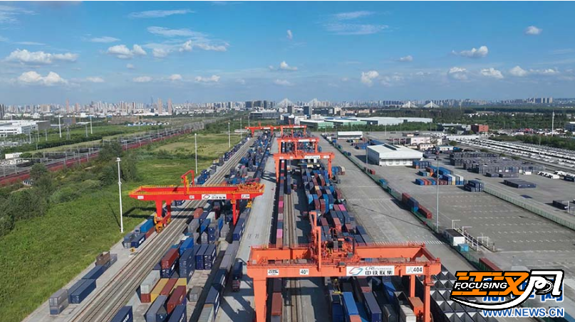 图为中欧班列(武汉)在中铁联集武汉中心站装卸货物 新华网发 邢晨摄