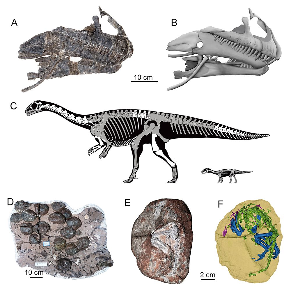 图A、B为守护黔龙的头骨;图C为成体和幼体骨骼复原图;图D为蛋窝;图E、F为胚胎化石及3D重建图。新华网发 中国地质大学(武汉)供图
