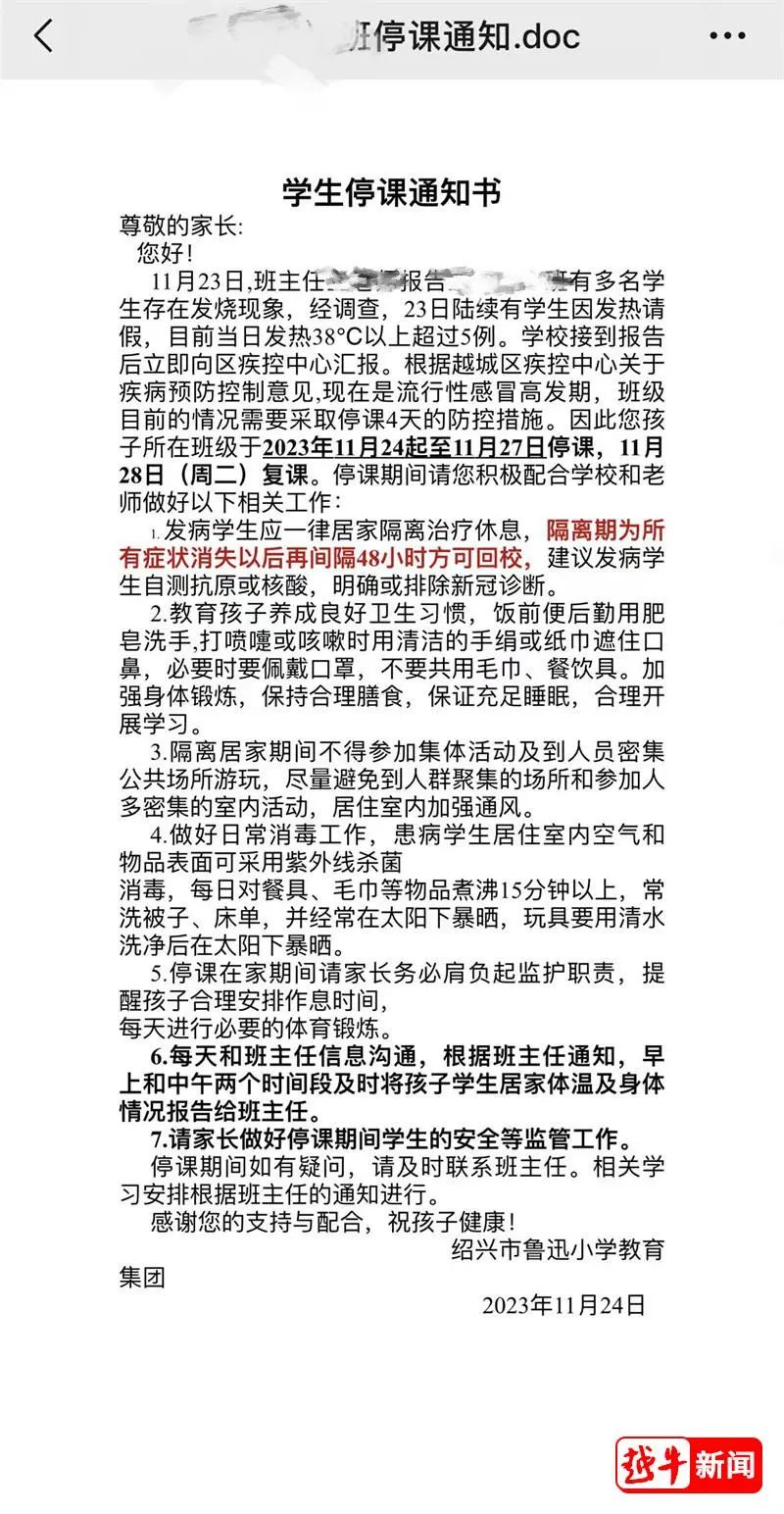 近日,据越牛新闻报道,浙江绍兴越城区鲁迅小学(人民路校区)有班级多名学生因发热请假,目前已下发停课通知。据停课通知显示,11月23日,该班班主任报告班中多名学生存在发热现象,经调查,23日陆续有学生因发热请假,当日发热38℃以上超过5例。学校接到报告后立即向区疾控中心汇报。根据越城区疾控中心关于疾病预防控制意见,现在是流行性感冒高发期,班级目前的情况需要采取停课4天的防控措施。因此,该班级于11月24日起至11月27日停课,11月28日(周二)复课。