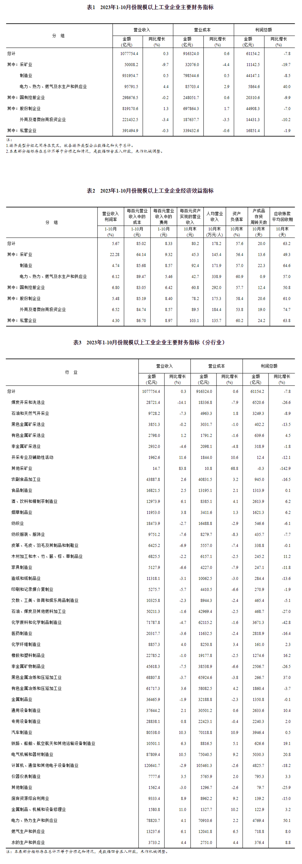 二、规模以上工业企业利润总额、营业收入等指标的增速均按可比口径计算。报告期数据与上年所公布的同指标数据之间有不可比因素,不能直接相比计算增速。其主要原因是:(一)根据统计制度,每年定期对规模以上工业企业调查范围进行调整。每年有部分企业达到规模标准纳入调查范围,也有部分企业因规模变小而退出调查范围,还有新建投产企业、破产、注(吊)销企业等变化。(二)加强统计执法,对统计执法检查中发现的不符合规模以上工业统计要求的企业进行了清理,对相关基数依规进行了修正。(三)加强数据质量管理,剔除跨地区、跨行业重复统计数据。