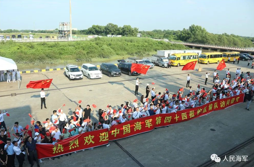 当地时间11月27日下午,海军第44批护航编队访问缅甸仰光。图为码头欢迎人群挥舞五星红旗,热烈欢迎海军官兵。张元虎 摄