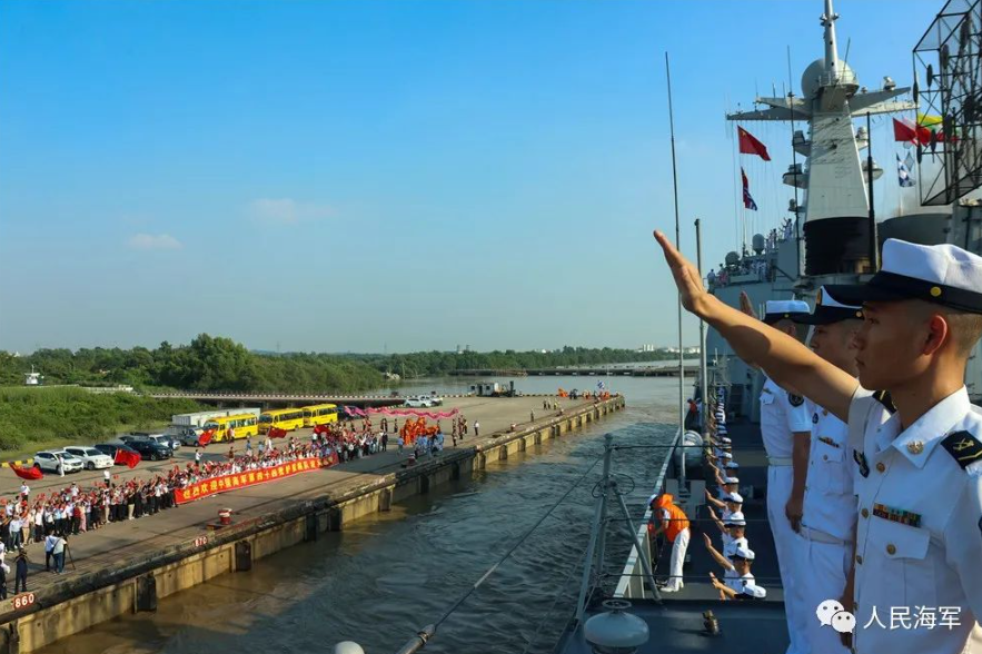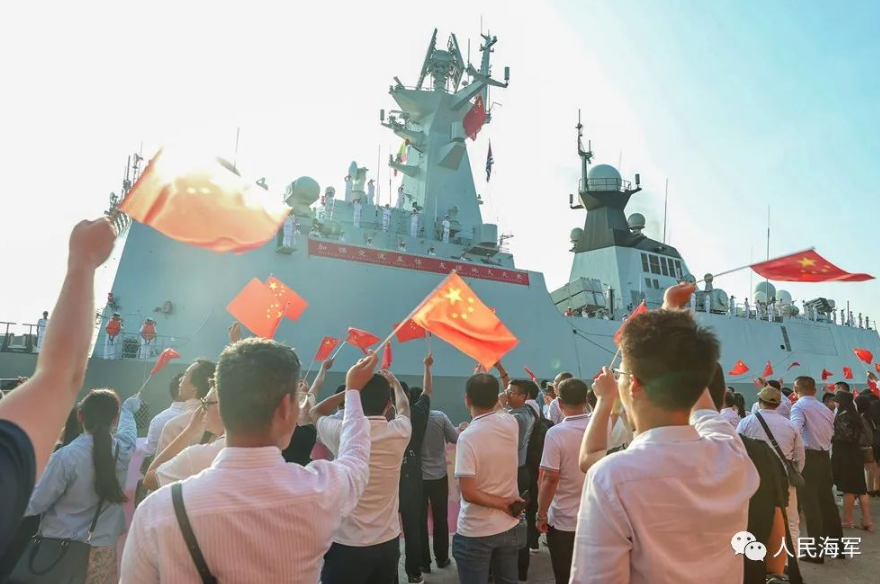 11月27日下午,海军第44批护航编队访问缅甸仰光。图为官兵整齐列队,向码头欢迎人群挥手致意。张元虎 摄