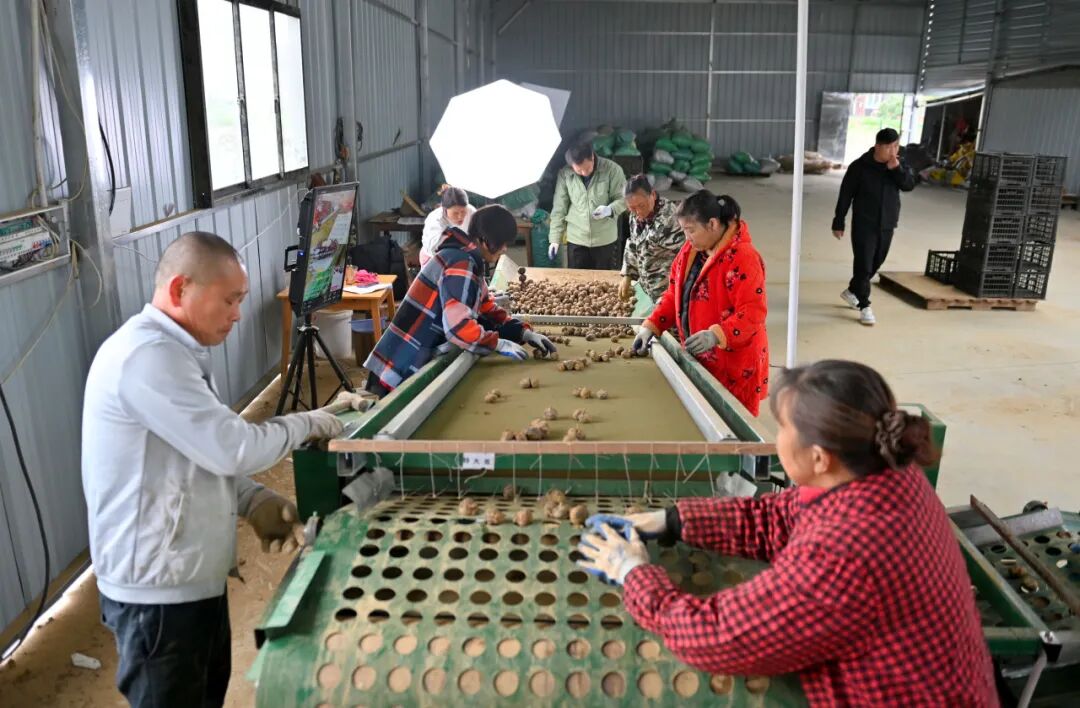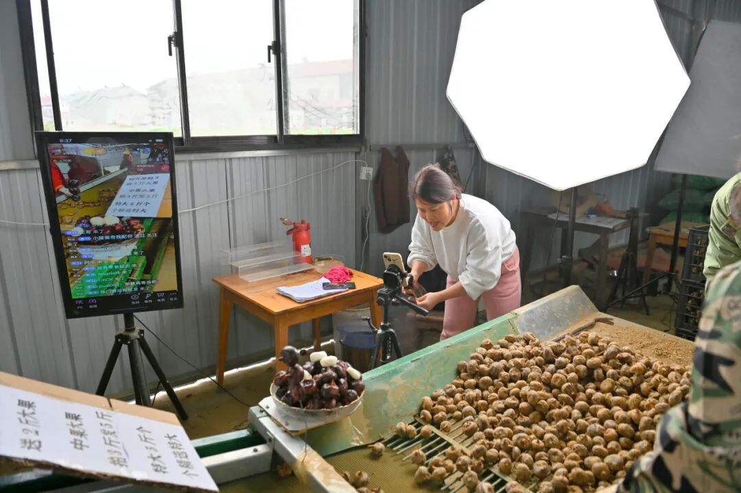 走进八岭山镇铜岭村铜铃人家果蔬旗舰店的仓库,工人们正在将荸荠装箱、打包……仓库门口,一件件快递“整装待发”。一旁的桌上,直播所用的大屏幕、话筒、支架、声卡、打光灯一应俱全。在这里,手机变身“新农具”、直播变成“新农活”、流量变成“新农资”。