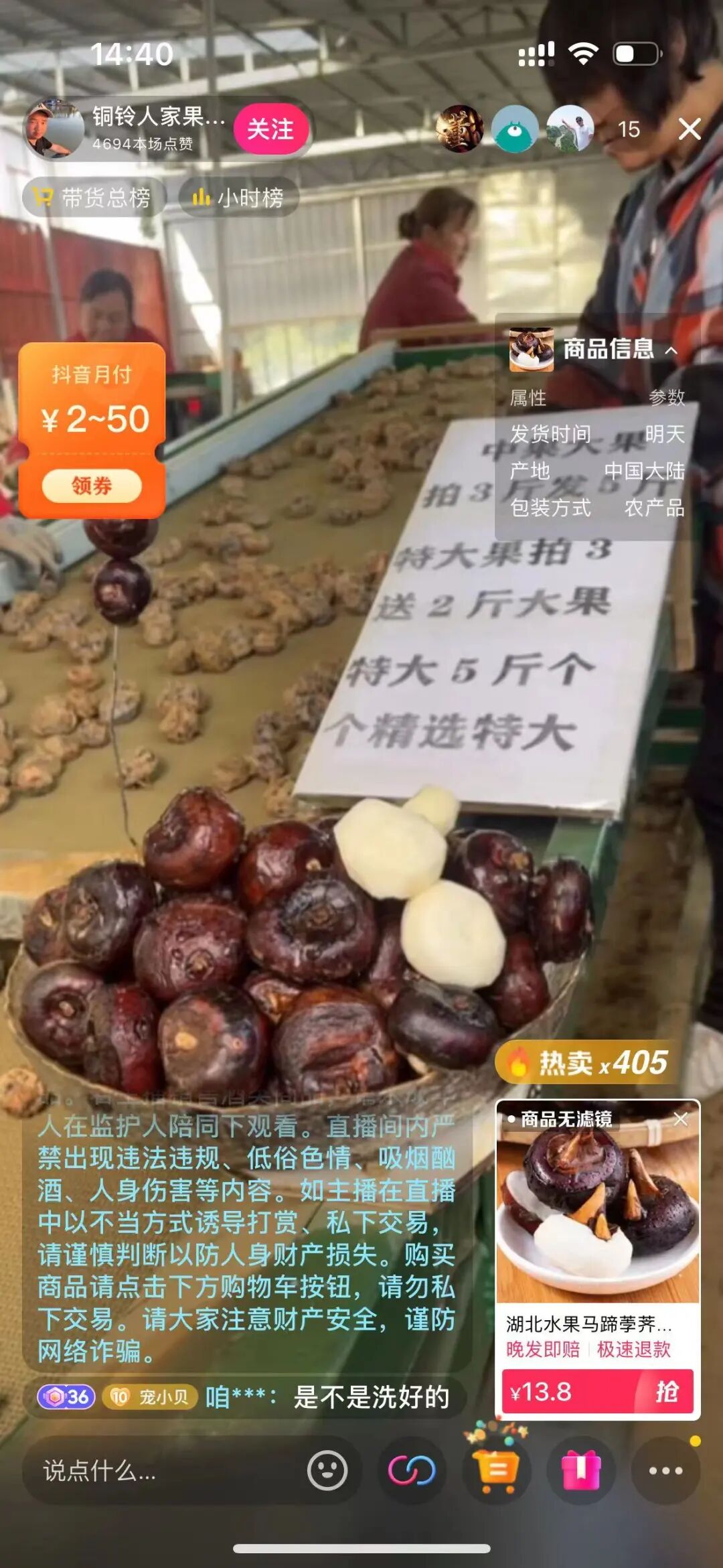 “大家好!欢迎大家来到我们直播间,爱吃马蹄(荸荠)的家人们一定要认准我们铜铃人家果蔬旗舰店……”主播“红姐”正在直播间里和粉丝们互动。