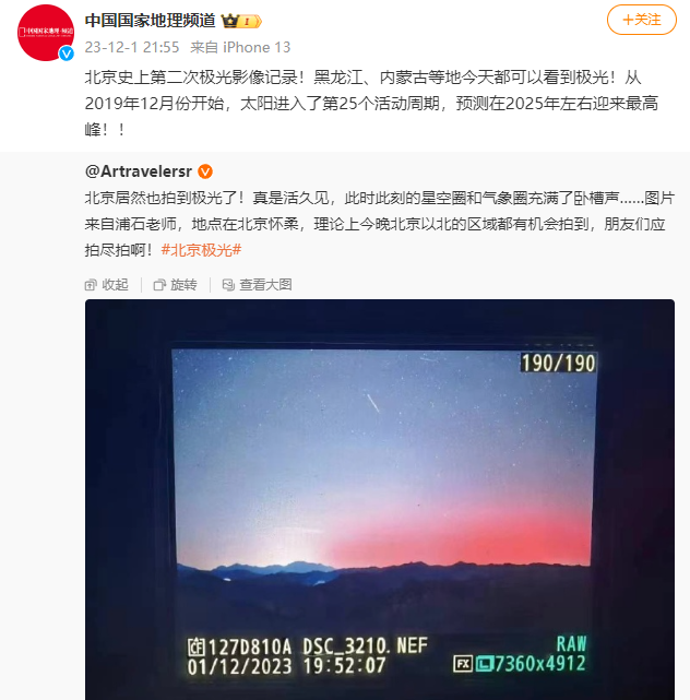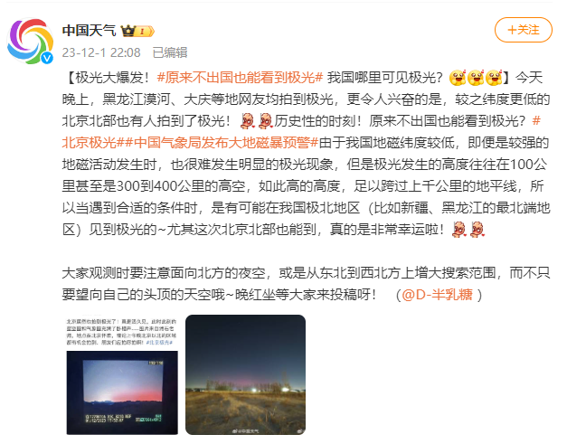 今天晚上,黑龙江漠河、大庆等地网友均拍到极光,更令人兴奋的是,较之纬度更低的北京北部也有人拍到了极光!历史性的时刻!原来不出国也能看到极光?