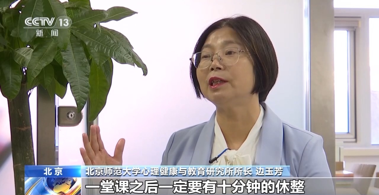 北京师范大学心理健康与教育研究所所长 边玉芳:从幼儿园开始,一直到小学初中高中,我们的注意力一直在发展,中间特别是在小学低年级的阶段,一堂课之后一定要有10分钟的休整。这是对我们学习的需要,注意力和大脑发展的需要,也是我们身体的需要。它是通过遵循孩子的成长规律来设置的,也包括我们孩子为什么要一个学期之后会有一个寒假暑假,都是有它要达成的除了有教育的功能,还有娱乐的功能,还有交往的功能,还有身体健康的功能。