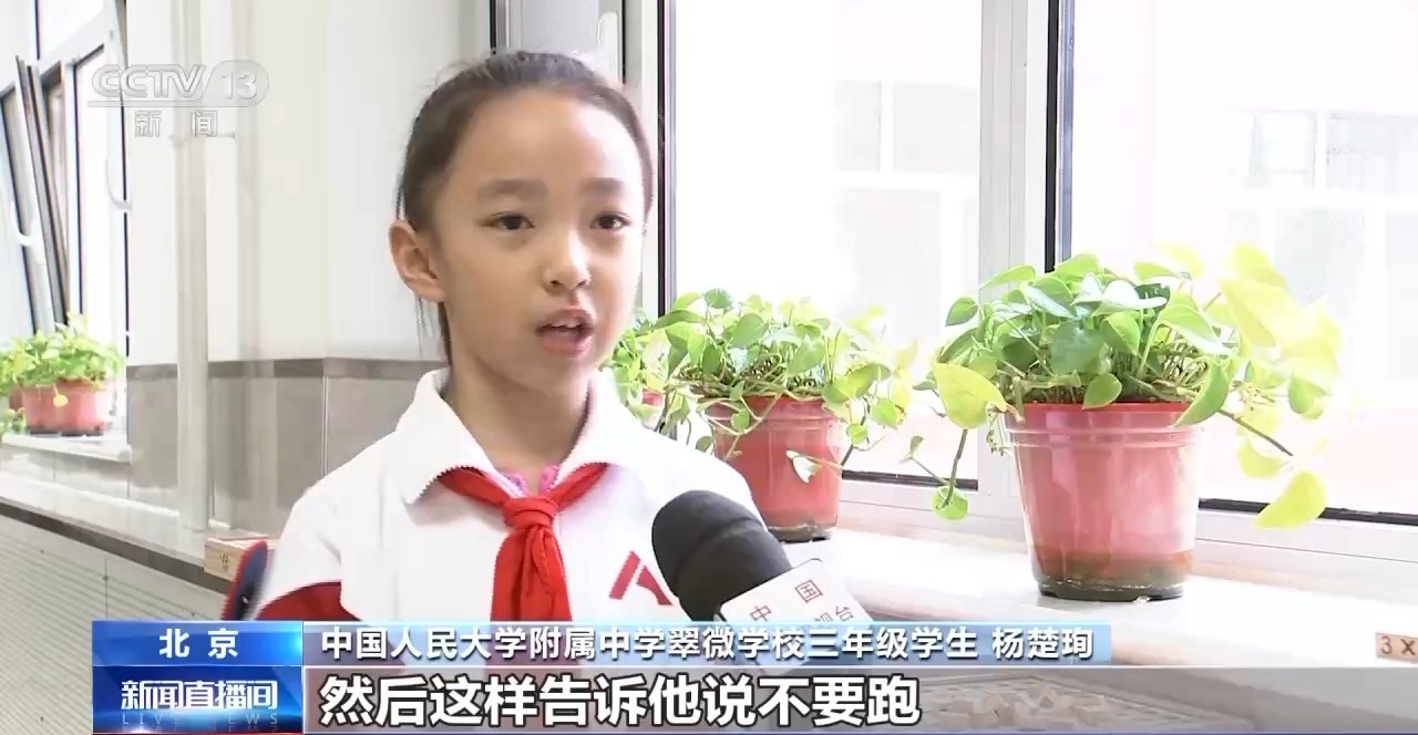 中国人民大学附属中学翠微学校三年级学生杨楚珣:每周五的时候会有培训。课间的时候楼道内可以玩,但是不可以大声喧哗,也不可以跑。一般看到有同学跑的话就拍一拍他,用手势告诉他说不要跑。如果楼道内有同学大声喧哗就会这样(手势)。如果他们表现很好,我会给他们竖一个大拇指(手势)。