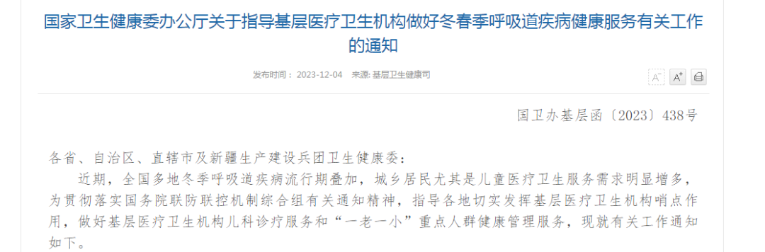 12月4日,国家卫健委发布《关于指导基层医疗卫生机构做好冬春季呼吸道疾病健康服务有关工作的通知》。