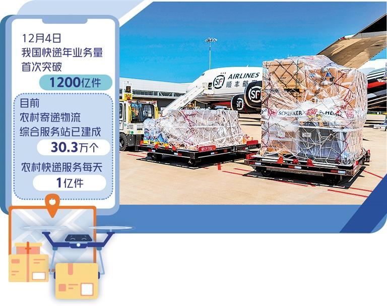 12月4日18时26分,国家邮政局邮政业安全中心监测数据显示,今年我国第1200亿件快件正式产生,标志着我国快递年业务量再次刷新纪录,首次突破1200亿件大关。