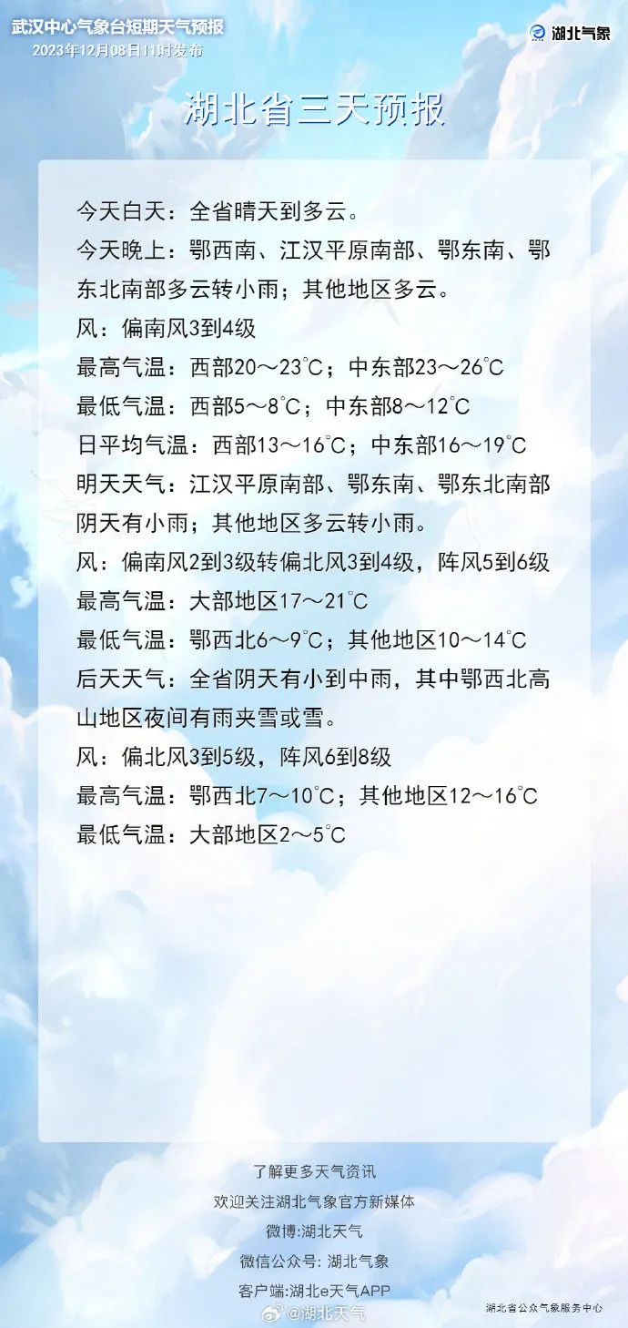 据湖北省气象局信息,预计9日起,湖北将出现连续阴雨天气,预计接下来一周都将笼罩在阴雨中。10日开始我省将迎来大风降温,后期将有多股冷空气不断南下,各地气温也将断崖式下降,西部高海拔地区又将飘起雪花。