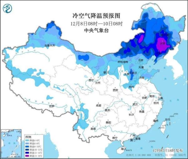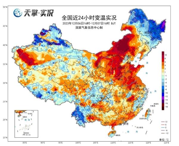 今天,中东部大部地区维持升温态势,多地将体验到12月同期罕见暖热。由于昼夜温差大,太原、石家庄等地一天可体验2个季节。然而,明天起,两轮冷空气“无缝衔接”,中东部多地将经历俯冲式降温:东北、华北、黄淮局地降幅超15℃,不少地方两三天最高气温累计降幅将超20℃。
