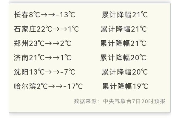 东北、华北南部、黄淮北部不少地方两三天最高气温累计降幅将超过20℃!