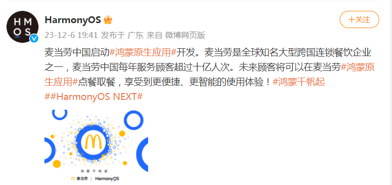 HarmonyOS微博截图华为表示,此次麦当劳中国APP宣布启动鸿蒙原生应用开发,既展现着其积极拓展业务板块及渠道的高效发展思路,也意味着鸿蒙生态在餐饮领域取得了重大突破,将全面升级用户的移动端使用体验。华为终端云服务开发者服务与平台部总裁望岳表示:“麦当劳中国启动鸿蒙原生应用开发,是鸿蒙生态发展在餐饮界的又一次重要突破。期待在全场景的鸿蒙生态中,麦当劳不断丰富用户体验,在中国发展取得更大成功。”
