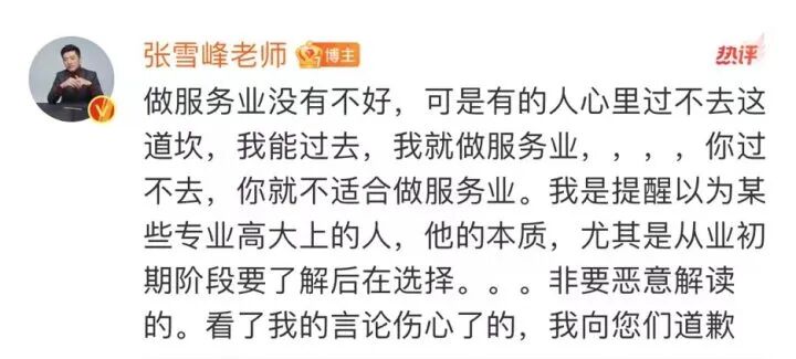 此后,他又在评论区表示, 做服务业没有不好,可是有的人心里过不去这道坎,我能过去,我就做服务业。你过不去,你就不适合做服务业。我是提醒以为某些专业高大上的人,他的本质,尤其是从业初期阶段要了解后再选择。非要恶意解读的,看了我的言论伤心了的,我向您们道歉。