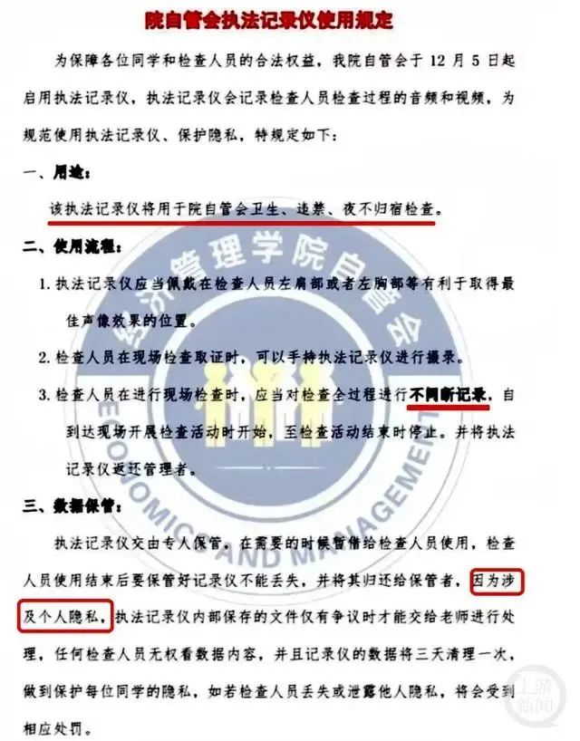 近日,江苏宿迁学院经济管理学院自管会发文称,检查人员从12月5日起启用执法记录仪,用于自管会卫生、违禁、夜不归宿检查。