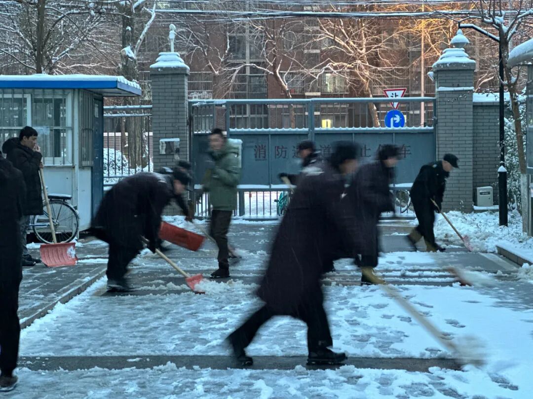 “老陈,咱们这先扫人行便道,这小门附近行人多,不少上班的、送孩子上学的,先扫出便道来让大家好走。”在小区西小门前,七八位物业师傅拿着除雪铲,相互配合着来回铲除着冰雪。仅仅不到五分钟,就清出了一条干净的通道。