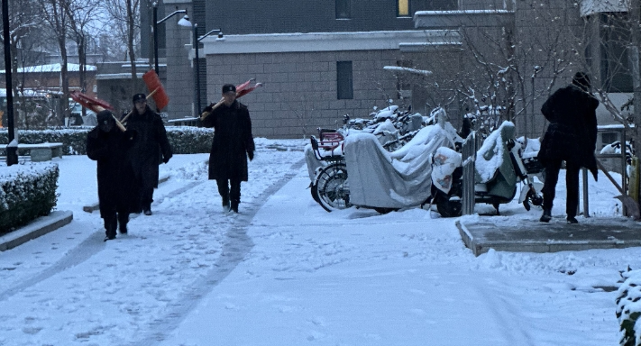 11日清晨6时许,伴着一夜落雪,北京海淀某小区里,已是一派繁忙景象,物业师傅分布在小区的各个角落扫雪铲冰。见此,不少热心的居民也走出家门,自带扫帚等工具来帮忙了。