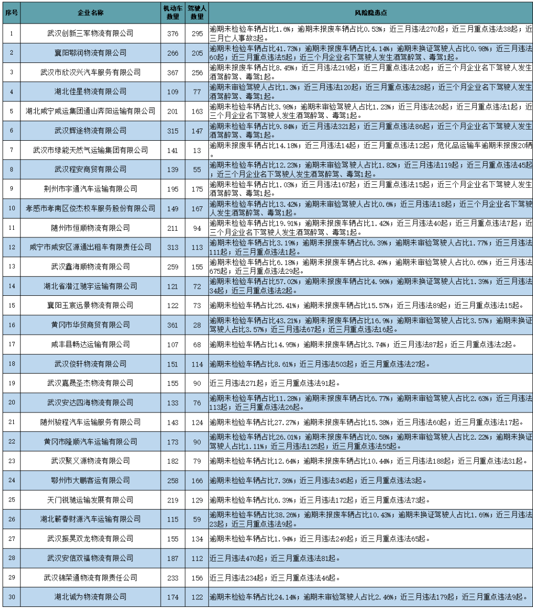 12月12日,据湖北交警微信号消息,湖北这30家企业因存在所属车辆、驾驶人逾期未检验、未报废、未审验、未换证以及交通违法等方面情况,被列为重点高风险运输企业。