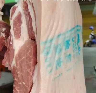 一路看过去,这些摊点经营的大部分白条鸡鸭都戴有二维码溯源脚环,猪肉也盖有检疫部门的印章。