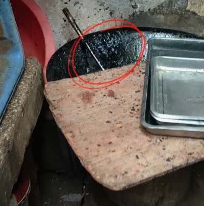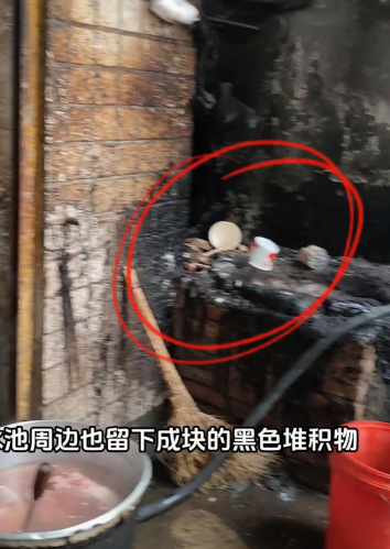 在店铺的墙角,一个大铁锅上半压着一块木板,隐约可见锅里面盛有黑色凝固物,锅周边的墙壁及水池周边,也能清晰看到成片的黑色堆积物。